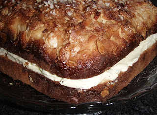 Die Mandelblättchen einrühren und auf dem Hefeteig verteilen. Im vorgeheizten Ofen bei 200 Grad ca 30 Minuten backen. Auf einem Gitter auskühlen lassen. Den Kuchen einmal Quer halbieren.