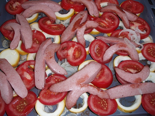 Backblech mit dem Öl bestreichen, in der Mitte des vorgeheizten Ofens auf 220° ca 3 Minuten heiss werden lassen, die enthäuteten, eingeschnittenen Cervelats drauf legen und die Zwiebeln verteilen, das alles ca 5 Minuten zusammen 5 Minuten im Ofen anbraten. Blech heraus nehmen und die Cervelat beiseite legen.Die Tomaten und Zucchettischeiben auf dem Blech verteilen, habe ich eine grosse Menge schichte ich sie ziegelartig auf das Blech legen und die Cervelats wieder darauf verteilen.Hitze auf 200 grad reduzieren und das ganze ca 20 Minuten braten. Am Schluss mit Salz und Pfeffer abschmecken und den Oregano verteilen. Dazu passen Bratkartoffeln und Salat.