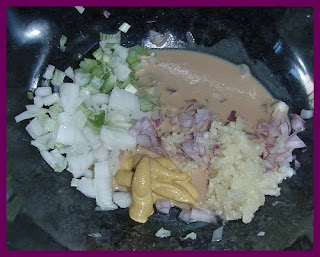 Die Bohnen rüsten und kochen, ich habe das im Steamer gemacht und sie da bei 100° 30 Minuten gegart. Währenddessen die Sauce bereitstellen. Die rote Zwiebel fein schneiden, ebenfalls die Frühlingszwiebel samt schönem Grün. Die Knoblizehen gepresst dazugeben, 1 Esslöffel Senf und Salatsauce nach Wahl alles zusammen mischen und die heissen Bohnen darin marinieren bis zum Essen.