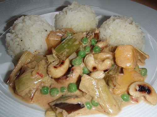 Curry ist eine Leidenschaft, die mich schon Jahre begleitet. Ich mag mich erinnern, als wir im Berner Oberland in den Skiferien waren, sind wir Jahr für Jahr in ein bestimmtes Restaurant und da bestellte ich Riz Casimir. Noch heute ist das in meiner Erinnerung das weltbeste, obschon diese Erinnerung mindestens 20 Jahre zurückliegt. Als ich dann aus dem Salatsaucenkochalter raus war, habe ich mein eigenes Riz Casimir gekocht. Das sind meine ersten Erinnerung an die Gewürzmischung Curry. Noch heute sind die Curry’s (klick) einer meiner liebsten Gerichte und dementsprechend oft wird das auch gekocht. Mein Liebster teilt diese Leidenschaft und bei den Kindern kommt so langsam das gern haben dieser Gerichte. Der Jüngste liebt ebenfalls das Früchtecurry (klick), vorallem wenn es viel Ananas drin hat. Kürzlich in der Coopzeitung (klick) war ein vegetarisches Curry, oder zumindest ein Fleischloses, mit Lauch und Mango. Herrlich hat es uns geschmeckt und steht für nächste Woche bereits wieder auf dem Programm. Anstelle der empfohlenen Pappadams habe ich Basmatireis serviert.