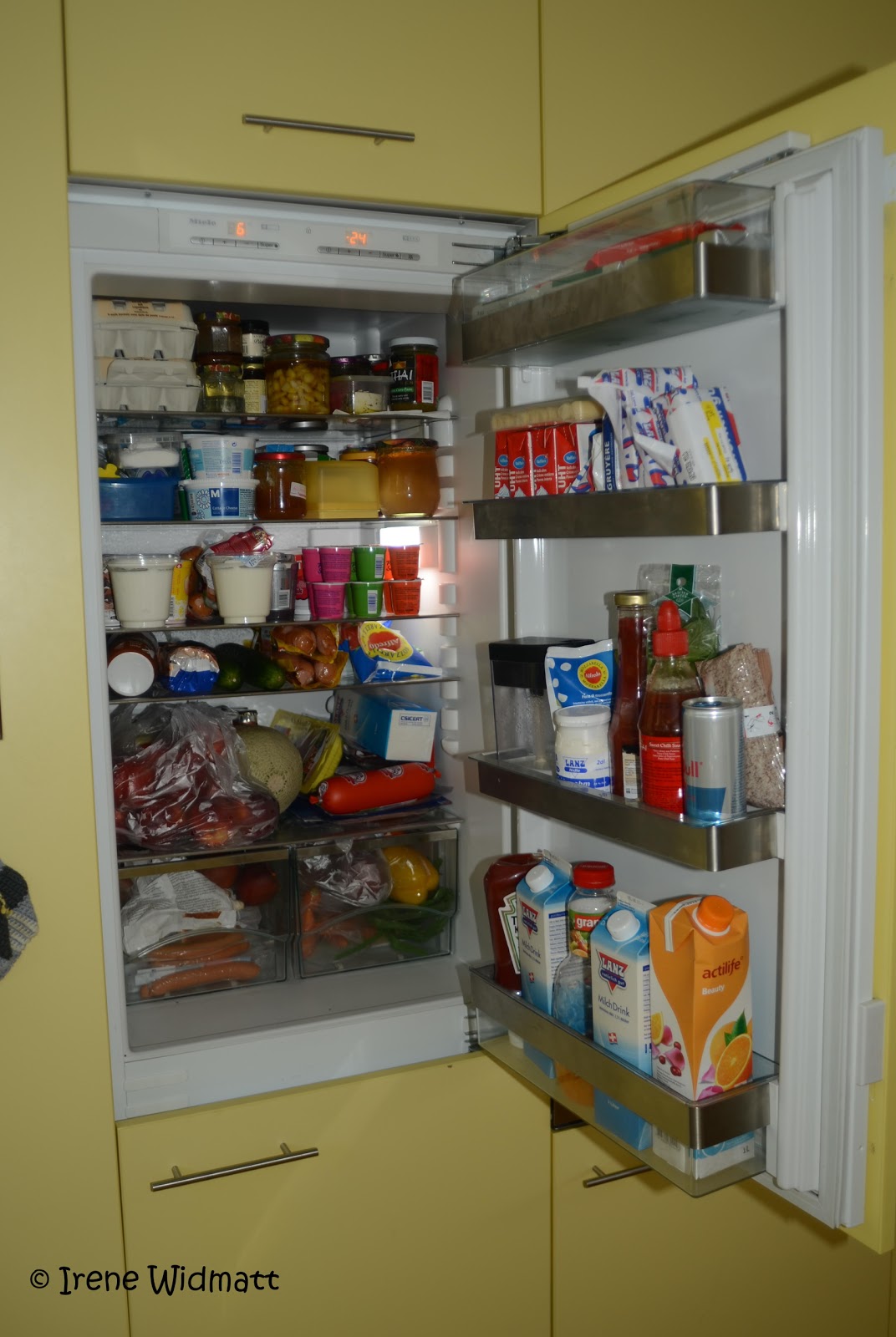 Vor 2-3 Tagen stiess ich bei G+ (oder war es doch Facebook?) auf den Link wo man in 35 Amerikanische Kühlschränke gucken konnte. Ich amüsierte mich ab den Lebensmittel und Getränke die darin standen, oder zT Foodboxen so weit das Auge reicht und das in einem Singlehaushalt….. Nun haben einige FoodbloggerInnen ihren Kühlschrank fotografiert und in den Blog gestellt, interessant wie ich finde. Da ich neugierig bin und gerne in andere Kühlschränke gucke, ist es nur fair wenn ich den unsrigen auch zeige. Ich war heute Mittag einkaufen, noch fehlt das Fleisch vom Metzger und der Salat, das wird erst am Samstag gekauft. Tomaten/Äpfel/Kiwi und Avocado kann ich gut offen in der Küche lagern, doch Melone/Pfirsiche und Nektarinen sind im Kühlschrank und ich nehme morgens soviel raus wie wir brauchen. E voilà unser Kühlschrank