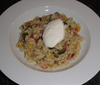 Das Gemüse hinzugeben, und etwas rührbraten. Mit dem Wasser ablöschen und das Gemüsebouillongranulat zugeben.Ca.20 Minuten kochen. Anrichten und mit einem Esslöffel Creme fraiche dekorieren.