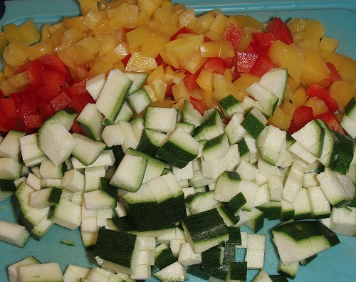 Die Peperoni und die Zuccini in kleine Würfeli schneiden.