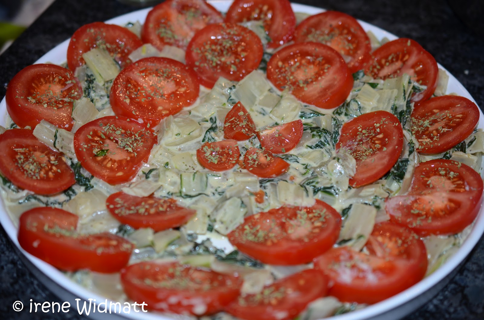 Nun ja hier sagt man ja *Soledurner Märet*, gemeint ist einer der wohl schönsten Märkten der Schweiz. Jeden Samstag und Mittwoch zwischen 7.15 und 12.15 kann man in der Solothurner Altstadt zwischen der St. Ursen Kathedrale und dem Bieltor einkaufen. Es gibt eine Buchreihe das Marktkochbuch, nach Luzern, Bellinzona und Zürich sind nun auch die Städte Bern und Solothurn vertreten. Das Solothurner Buch ist gefüllt mit vielen tollen Bilder, von den Rezepten aber auch vom Märet selber. Unter den Rezepten finden sich auch welche von MarktbesucherInnen oder StandbesitzerInnen. Als erstes Rezept habe ich den Krautstielgratin mit Tomaten nachgekocht. Bei der Recherche im Internet fand ich heraus, dass es üblich ist Krautstiel mit Tomaten zu essen. Oder zumindest um die Krautsiele schmackhafter zu machen, wie ich oft gelesen habe. Ich kenne das so nicht, als Kind gab es bei uns zu Hause viel Krautstiel. Wuchs er doch im Garten und auch die Grosseltern hatten viel davon abzugeben. Meistens überbacken mit etwas Rahm oder Milch, Muskatnuss und viel Käse, so habe ich ihn in Erinnerung. Ich mochte den aber schon als Kind, was bei unseren nur zu einem Drittel der Fall ist. Mir hat diese Variante mit Tomaten aber sehr gut geschmeckt und vor allem bietet sie optisch mehr als wenn nur der Krautstiel gratiniert wird. Wie so oft in letzter Zeit, ersetzte ich Parmesan durch alten Sbrinz. Ich bekomme im Nachbarsdorf beim Käsereiladen 3 Jährigen.