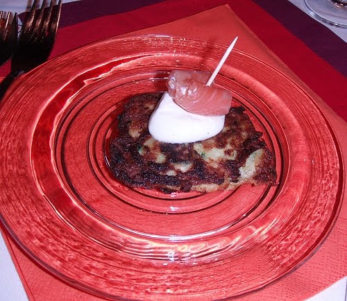 Amuse Bouche (steht nicht auf der Karte und gibt Zucchettirösti mit Lachs und etwas Meereetichmousse)