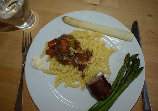 gebunden hat. Den Spargel am unteren Ende etwas anschneiden, den weissen etwa 2/3 mit dem Sparschäler rüsten. Beim grünen reichen ein paar Millimeter anschneiden, sofern er frisch ist. Den weissen Spargel habe ich 12 Minuten im Dampf bei 100 Grad gegart und den grünen 7 Minuten. Dazu habe ich noch Teigwaren und Kopfsalat serviert. Ein Festessen!