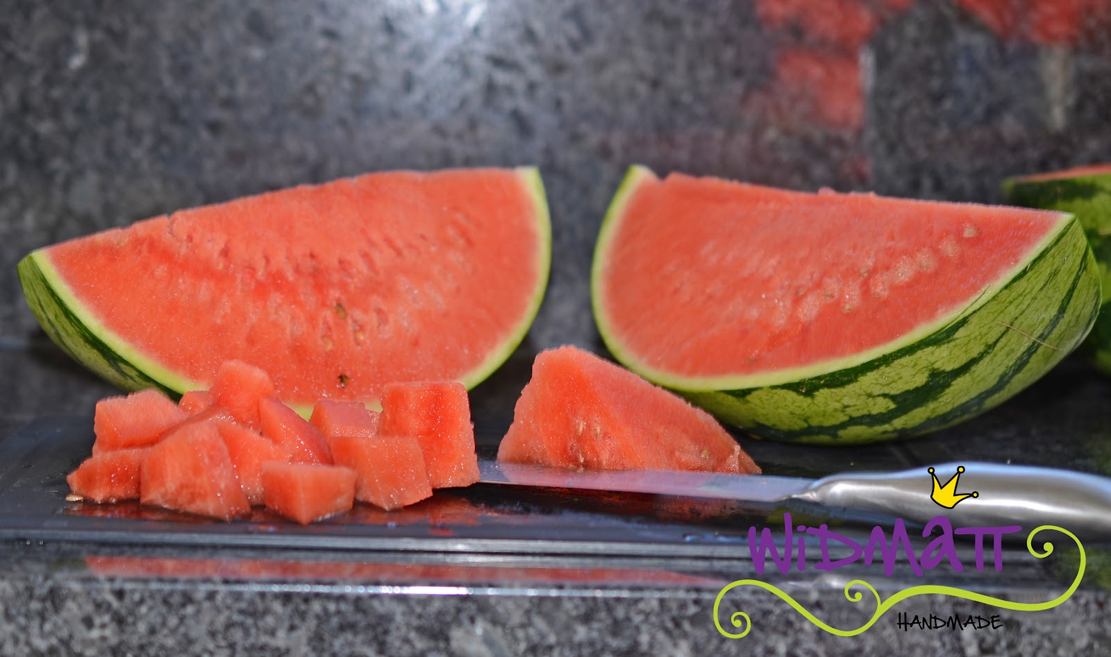 Dieses Rezept hängt schon seit Wochen an meiner Magnetwand in der Küche. Wassermelone(n) hatten wir bis jetzt oft und in grossen Mengen hier, doch für Sirup hat es nie gereicht. Die Kinder und wir finden Wassermelone etwas ganz besonders feines. Für die drei Widmattkinder am liebsten in Ecke geschnitten und für uns auch mal in Tomatensalat. So habe ich beim Bauern eine ganze Wassermelone gekauft und gleich zu Hause aus einem Drittel Sirup angesetzt. Der Sirup ist keine Hexerei, genügend Zeit einplanen da er über Nacht zeihen muss, bevor er aufgekocht und durch ein Sieb gestrichen wird. Heiss in Flaschen abfüllen und fertig ist ein köstlicher Sirup, der sich auch eignet in Weisswein oder Prosecco. Eine der Flaschen habe ich ins Päckli für die Tauschaktion *Postaus meiner Küche* verpackt.