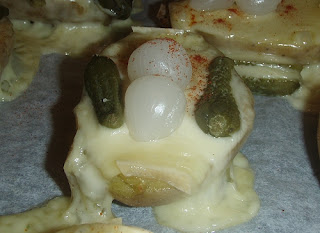 Wir haben 1.2 Kilo Kartoffeln genommen und je die Hälfte einer Füllung zubereitet, dazu gab es Blattsalat.